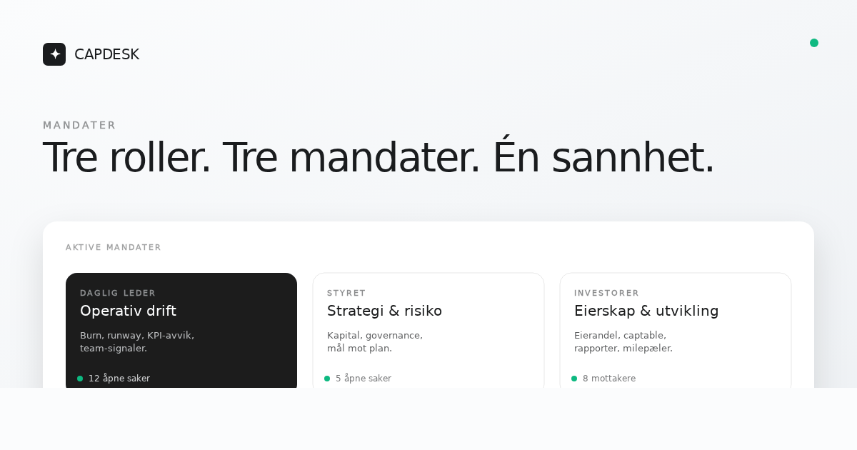 Bytt mandat øverst i Kontoret, så endrer hele plattformen tone, fokus og hvilke forslag AI-rådgiveren kommer med. Én sannhet, riktig kontekst, riktig konfidensialitet.