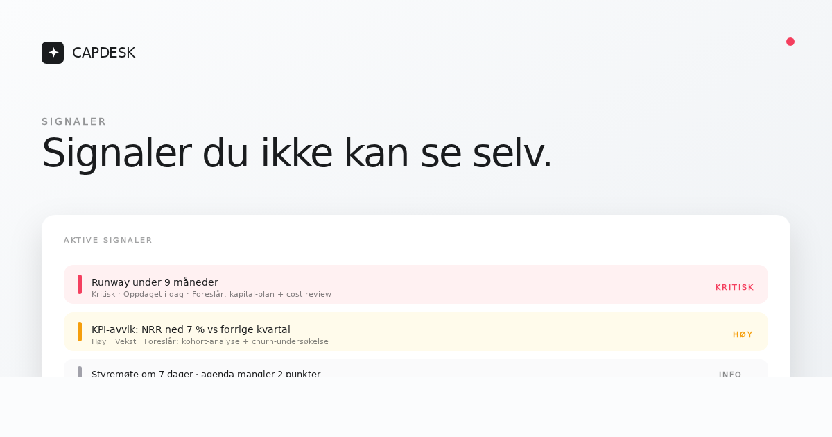 Capdesk overvåker tall, dokumenter og hendelser kontinuerlig. Når noe avviker fra mål, terskler eller historisk mønster, dukker signalet opp i Kontoret med forslag til tiltak.